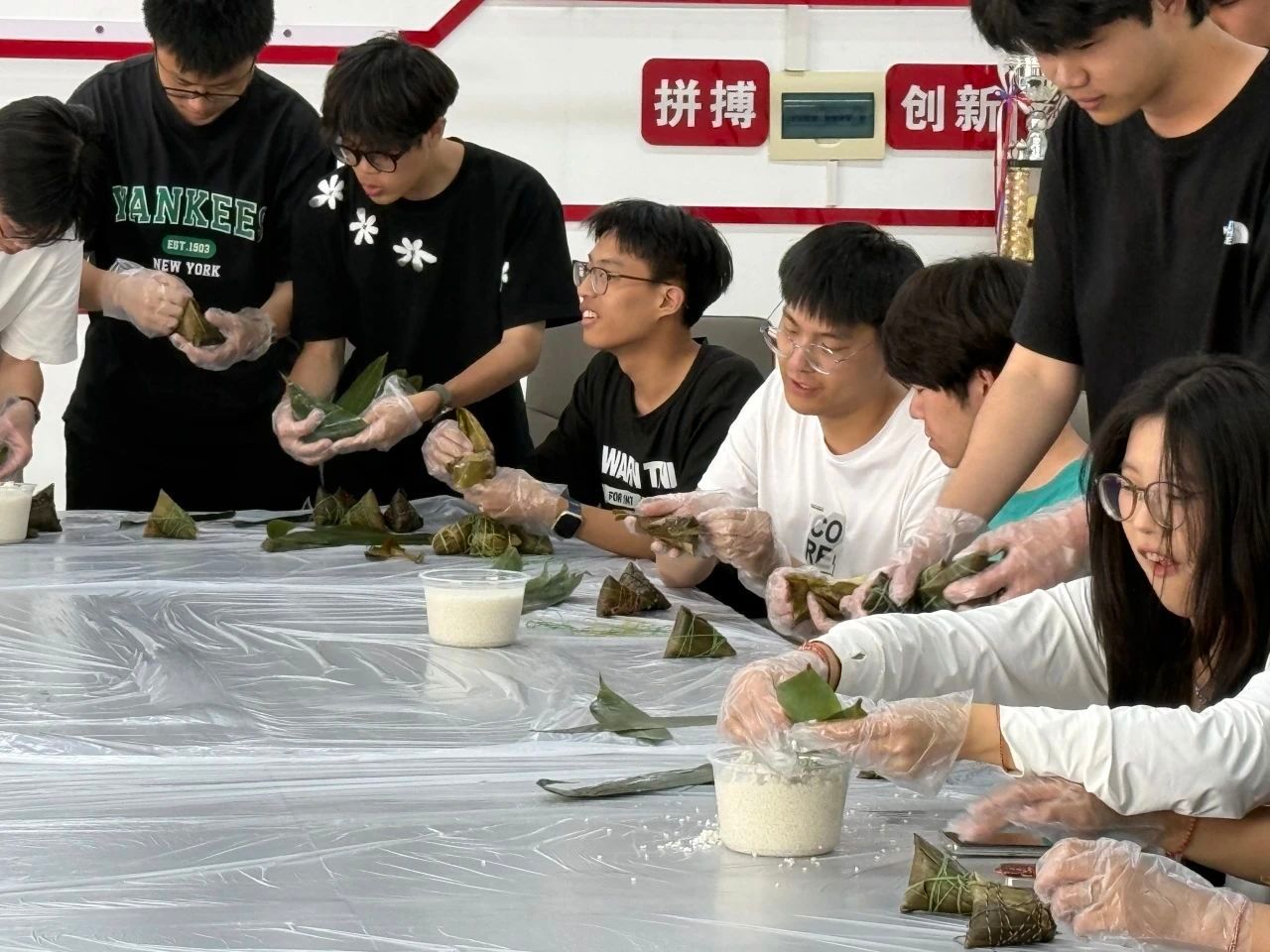 在创意比拼包粽子环节,现场气氛热烈。同学们自由组队,热情高涨。只见粽叶在手中翻转,糯米、馅料有序填入,大家手法虽青涩却充满干劲。不一会儿,形态各异的粽子诞生,有“胖墩墩”的三角粽,也有“瘦长型”的四角粽,创意与欢乐在这一方小天地里肆意蔓延。