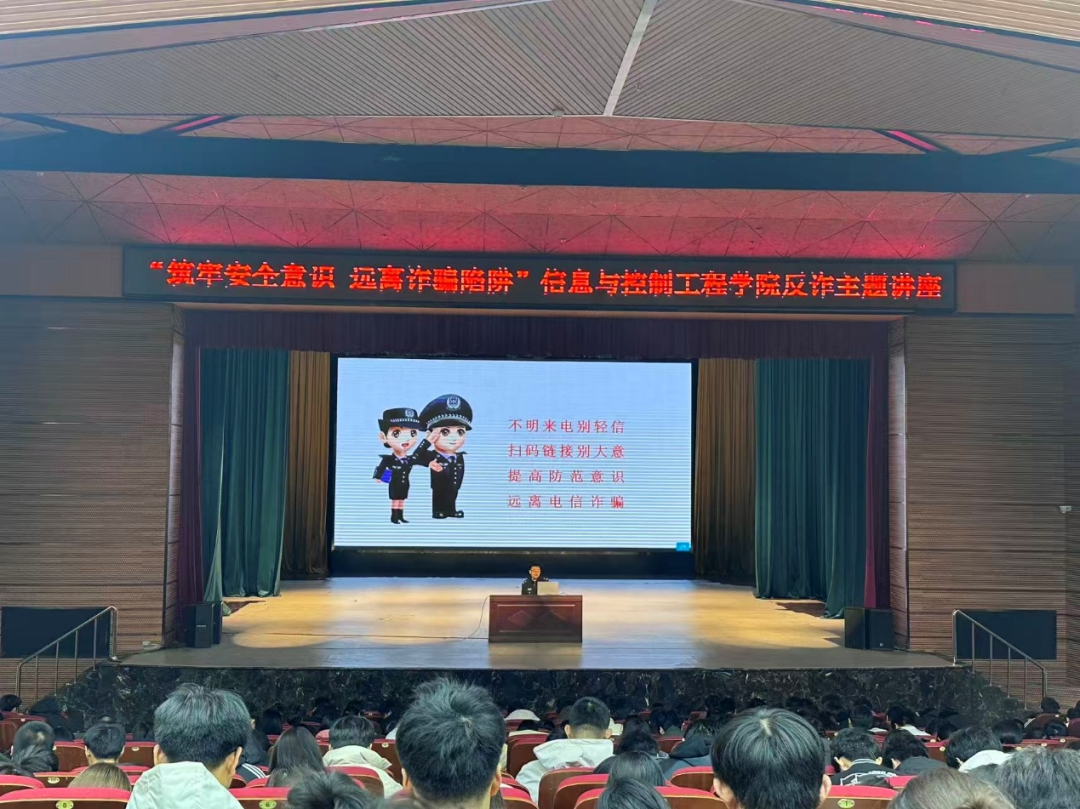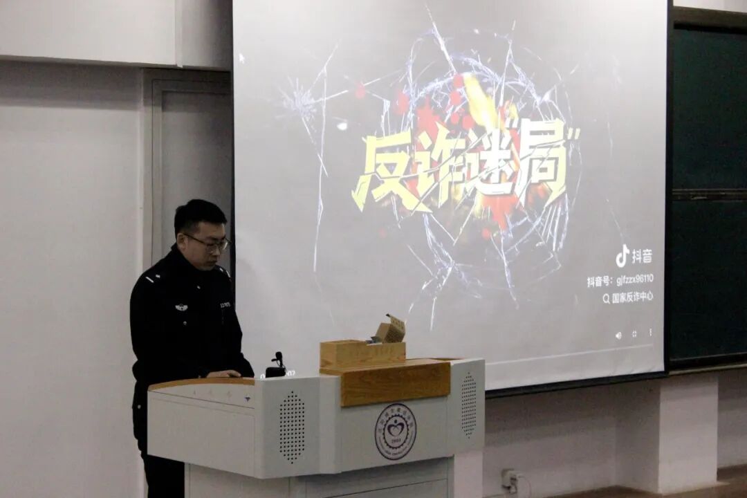 讲座首先通过播放近期高发案例的视频,向学生们介绍了常见的诈骗形式,直指当前诈骗犯罪的隐蔽性与危害性,迅速引发学生关注。随后,警官围绕两类核心诈骗类型展开详细讲解:在电信诈骗板块,通过还原“虚假投资”“冒充亲友借款”等典型场景,拆解骗子利用情感与利益诱导的话术逻辑;在网络购物诈骗板块,重点剖析“低价诱惑”“虚假物流理赔”等常见手段,提醒学生警惕非官方平台的交易风险。