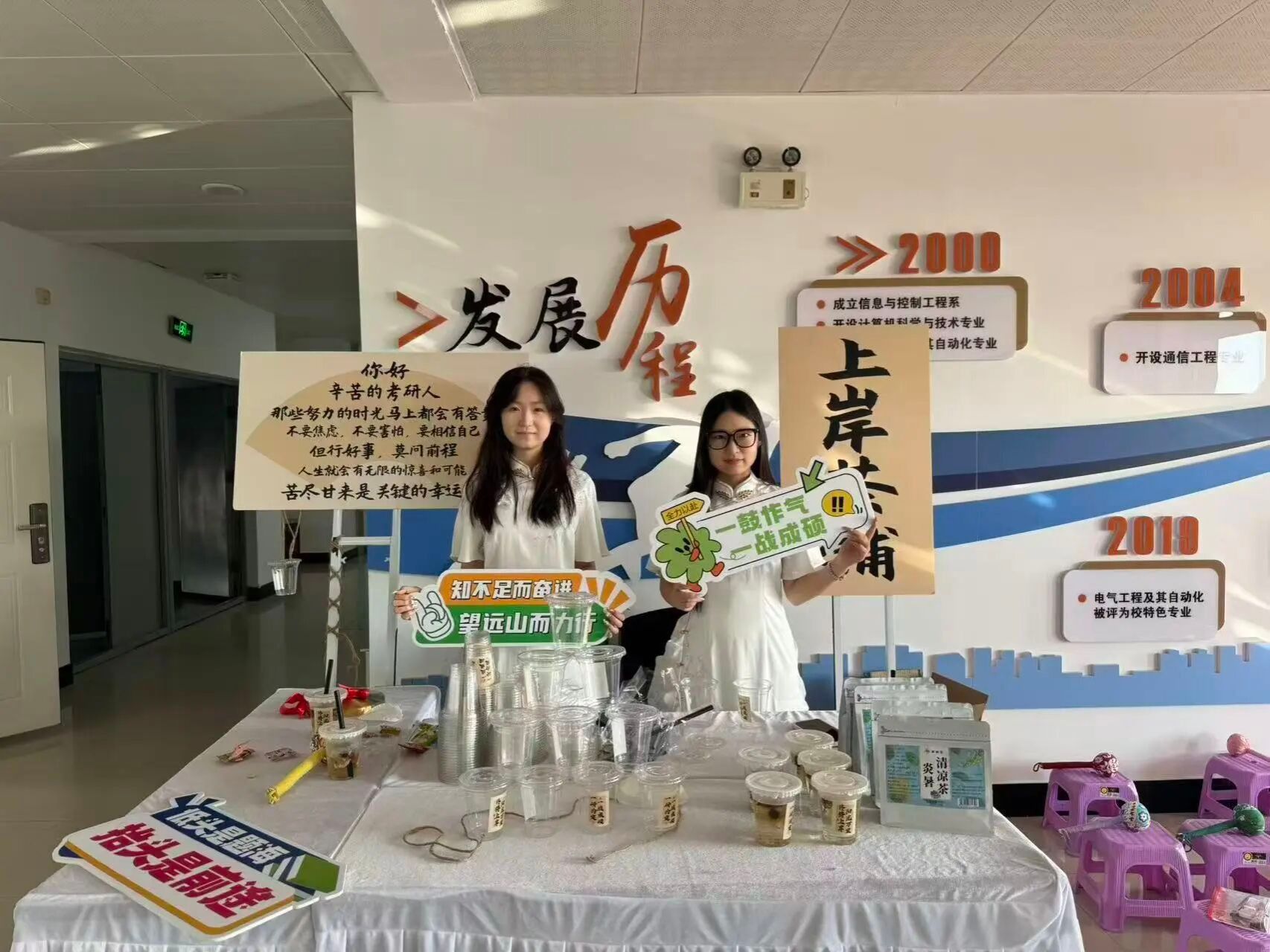 终极福利环节的“套圈区”堪称全场焦点,学子们攥着积累的“奋斗票”兑换套圈,排起长队瞄小锤子,定制小本等心仪奖品。这么多张票换来的,不仅是奖品,更像是一份“上岸好运”的预兆!现场特设的“上岸茶铺”暖意融融,志愿者们为学子们递上温热的梨茶、柠檬茶,并为考研学子送上真挚的祝福。