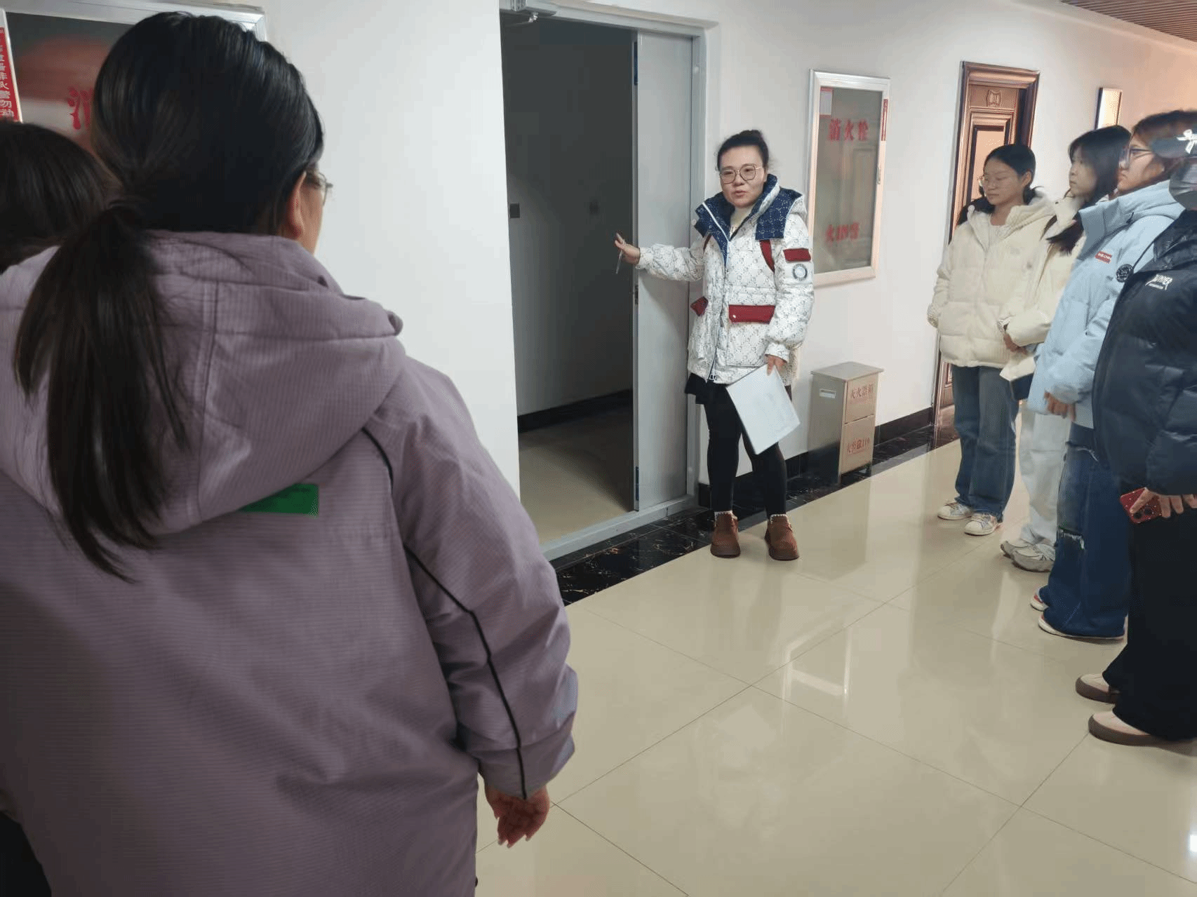各寝室长经培训后,向各寝室进行领学,主要内容包括逃生演习路线、注意事项、消火栓及灭火器的使用注意事项等。