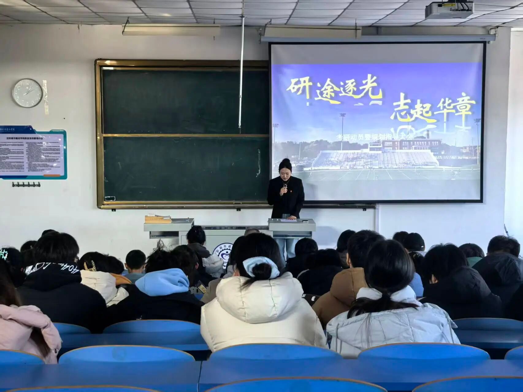 最后,郝培锋作动员讲话,他充分肯定了学生们追求梦想、勇于拼搏的精神风貌。并结合当前高等教育发展趋势与行业人才需求导向,从个人成长、职业发展、社会贡献等多个维度,深刻阐述了考研的重要意义,鼓励学生们坚定考研信念、保持昂扬斗志,以科学的方法、不懈的坚持攻克备考难关,在逐梦路上勇毅前行,用奋斗书写青春华章。