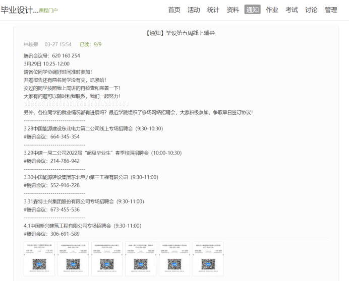 二是充分做好课前的准备工作。针对线上教学看不见摸不着的特点,为确保能够将课程通知发到每一名学生手中,授课教师通过学习通、微信等多种方式与学生交流,并指定一名班级负责人进行监督和查漏补缺,确保每一名学生都能够及时收到课程通知、材料和动态。同时,提前将各种授课资料分享给学生,并在课前提出授课要求,确保学生课前准备工作坚实有效。